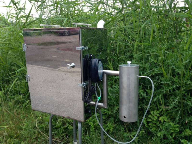 На потолке камеры нужно сделать отверстие небольшого диаметра для дымогенератора. Он может быть сделан из старого бидона, термоса или металлической трубы, диаметром 10 см и длиной до 50 см. В его нижней части отверстие диаметром около 1 см, для подачи кислорода.