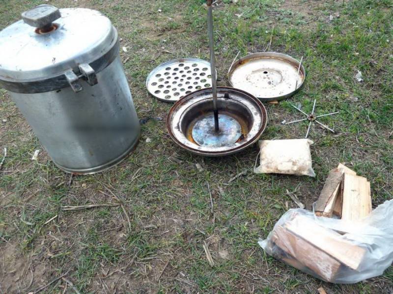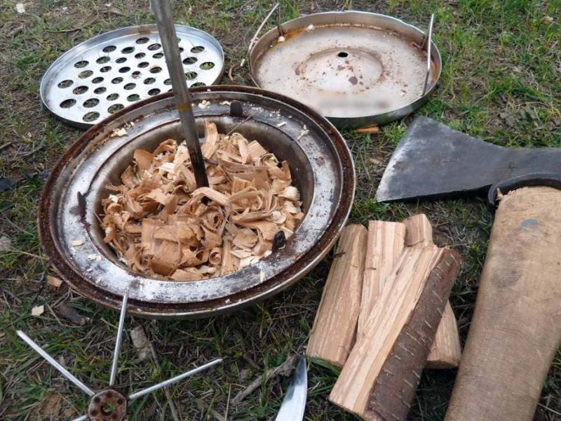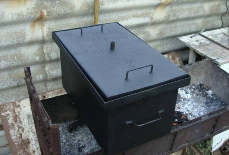 Слишком жарко можно использовать небольшой железный ящик с крышкой любой формы. Чем плотнее крышка, тем быстрее пойдет процесс. На дно ящика помещается сетка с небольшими отверстиями. Под нее укладывают щепу из ольхи, дуба или осины. Здесь можно использовать почти все три.