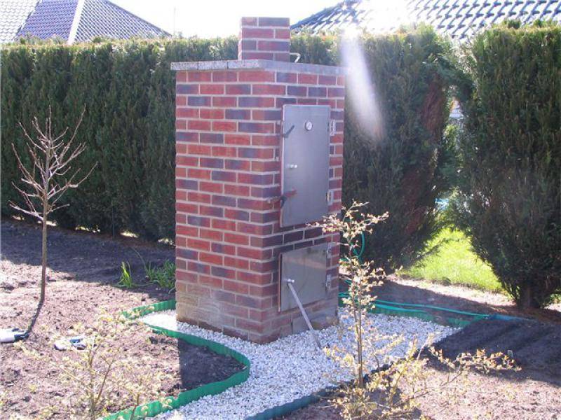 В конструкции коптильни холодного копчения своими руками особое место отводится дымоходу. Под него копается траншея, сверху укладывается негорючий материал, например, кирпич, шиферный или металлический лист. Для герметичности сверху насыпается земля или грунт, чтобы дым не просочился. Второй конец дымохода соединяется с коптилкой холодного копчения. Дымоход из кирпича можно сделать из печной трубы. Длина дымохода около 3 м, траншея шириной 50 см и глубиной 30 см.