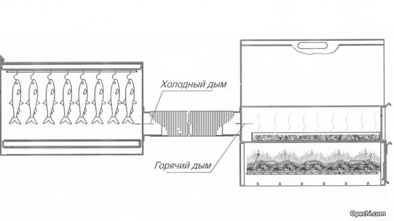 Холодное копчение продуктов происходит под воздействием теплого дыма, температура которого редко превышает границу в 36÷40 ºС. Получившийся от тления древесины дым успевает остывать по пути от топки к коптильной камере. Таким образом, в данной конструкции две основные камеры, дымогенераторная и коптильная, располагаются друг от друга на определенном расстоянии, и связываются посредством специальных каналов. Дым, проходя по заданной ему траектории, не только остывает до требуемой температуры, но еще и освобождается от вредных примесей и копоти, которые могли бы попасть в продукты, снижая их вкусовые качества.