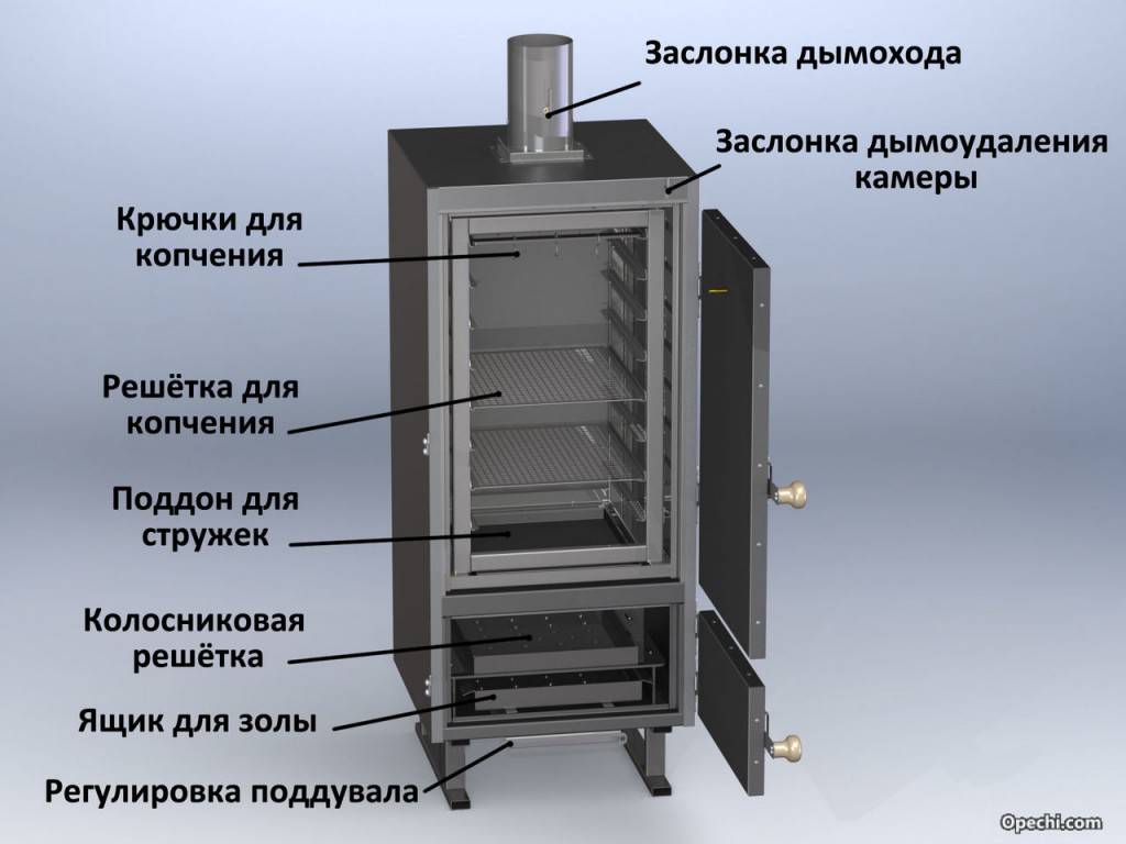 материал коптильни – очень важно, чтобы каждый из компонентов конструкции был сделан из безопасных материалов, которые не выделяют при горении вредных веществ;