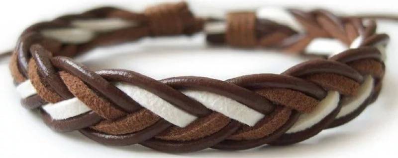 Самый простой вид плетеных браслетов из кожи — способом «косичка». Сплетать можно разные виды шнурков и полосок. Обычные коричневые и черные цвета подходят под различные стили одежды, более пестрые выбирают на летние яркие образы.