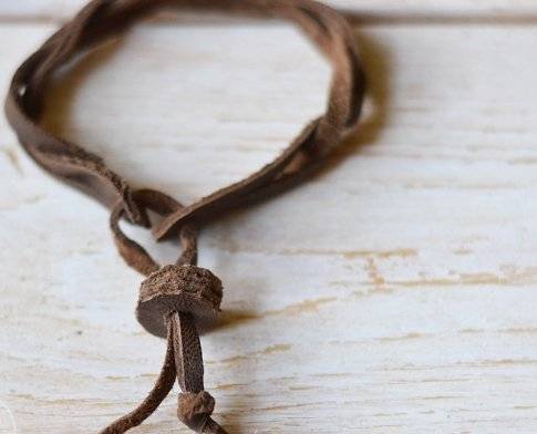 - Проденьте сквозь отверстия в браслете тонкий кожаный шнурок. Оба его края также протяните через получившуюся кожаную гайку. Края шнурка завяжите узелками.