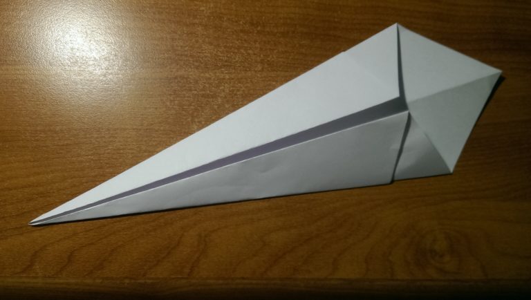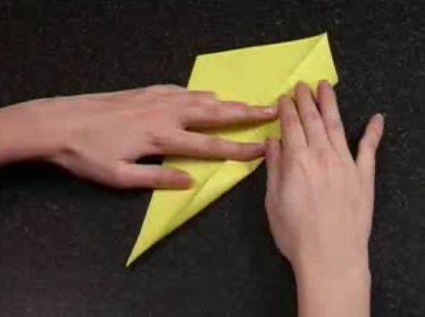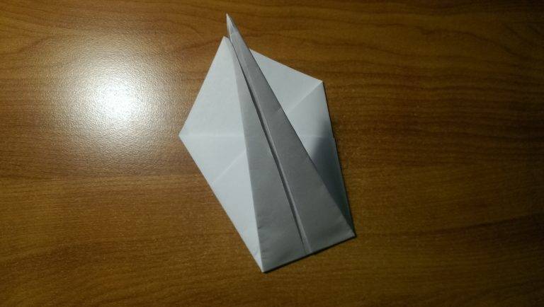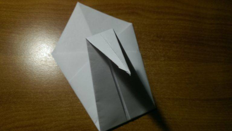 После этого заготовка переворачивается и сгладывается пополам. Одна линия сгиба будет впоследствии для создания шеи. Уголок остроконечного типа впереди будет поворачиваться по вертикали вверх.
