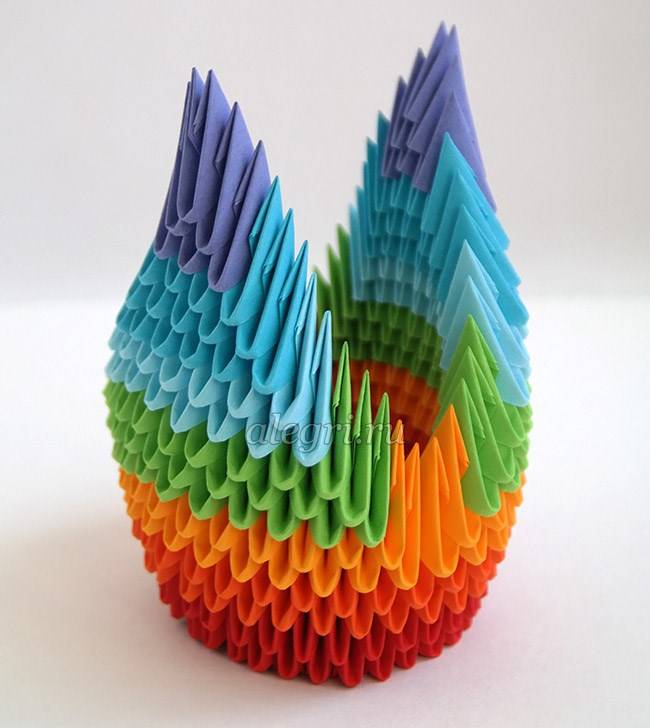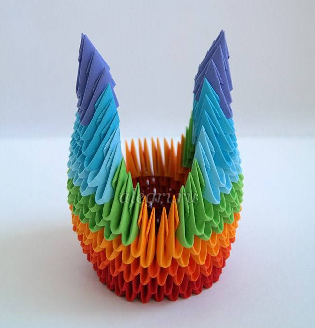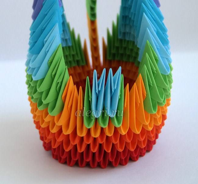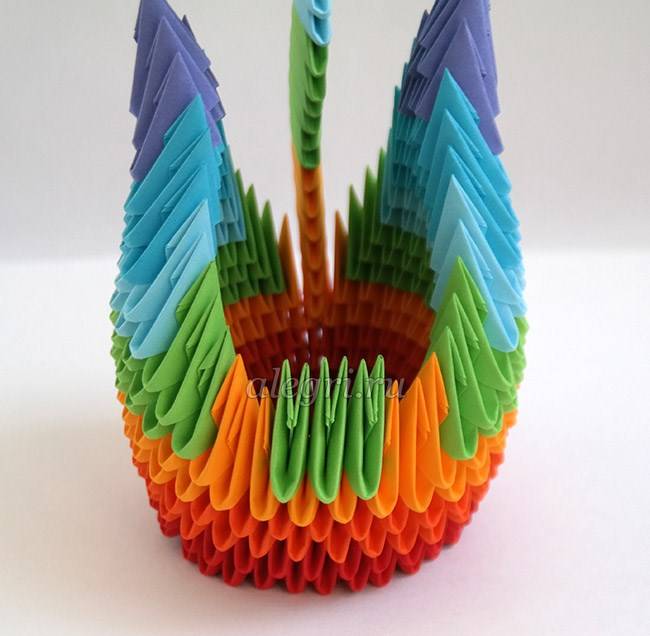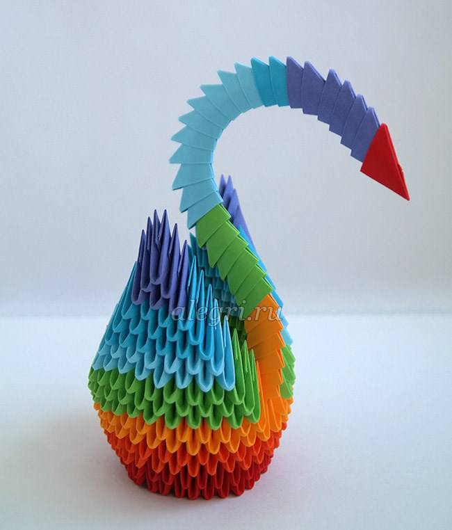 Если лебедь планируется цветной, то и модули нужно делать разного цвета. Черно-белый вариант исполнения также выглядит очень интересно. Если все элементы готовы можно начать сборку лебедя.