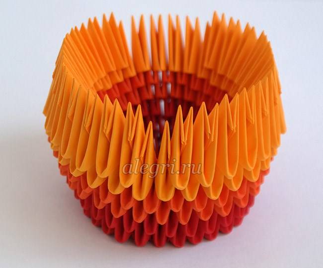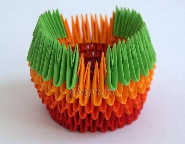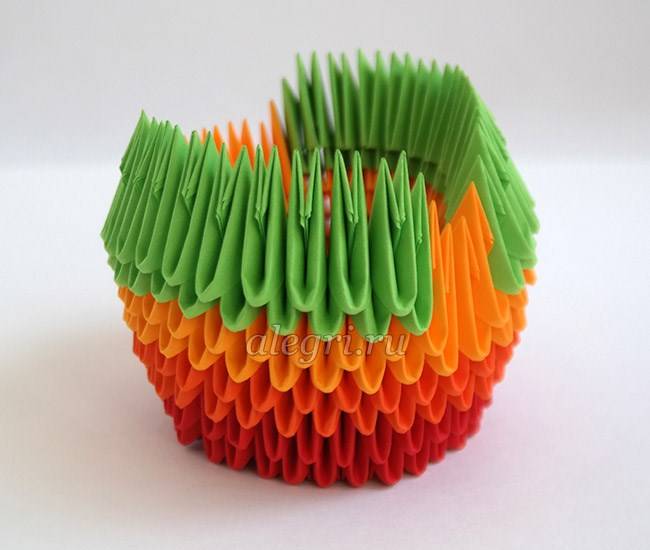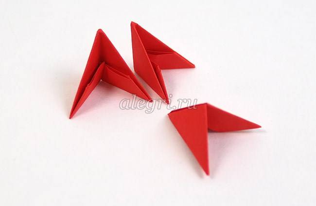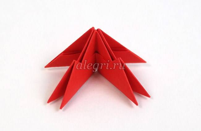 - Третий модуль поставить острым углом вниз. Вставить углы двух первых модулей в имеющиеся кармашки третьего модуля.