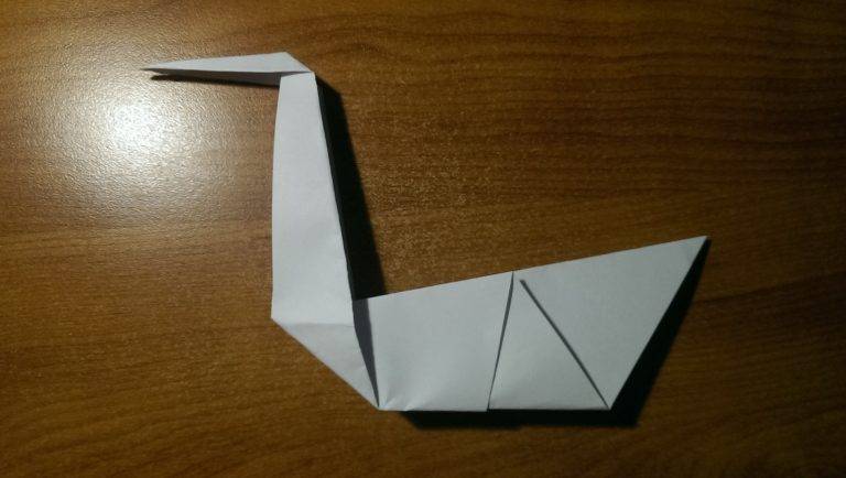 - На данном этапе фигура представляет собой лебедя, но без шеи и головы. Чтобы сделать шею, нужно загнуть к верху нижний острый угол.
