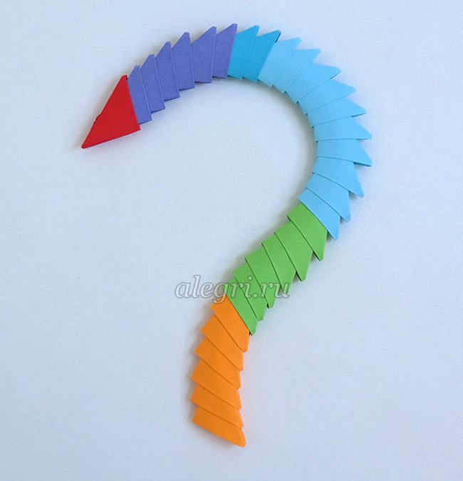 3. Собираем хвостик из трёх зелёных и двух голубых модулей.
