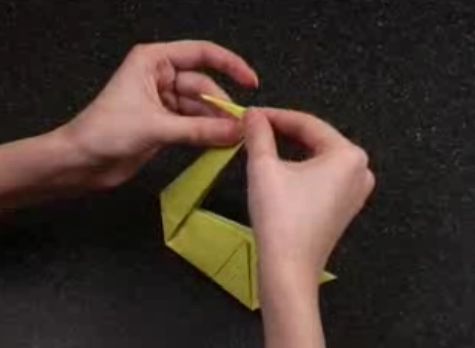 Для образования головы край треугольника требуется загнуть вперед, а для клюва делается еще два маленьких загиба, где фото оригами лебедь можно увидеть на рисунке снизу.