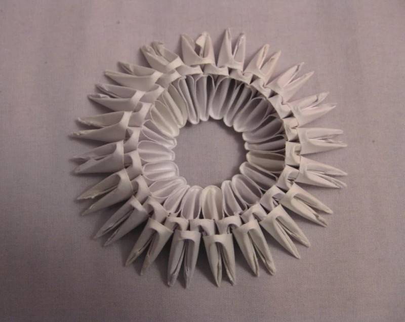 4. Поставьте получившийся круг на стол. Теперь сделайте второй ряд. Для этого вставьте вершины новых элементов в кармашки уже двух соседних из первого ряда, таким образом модули расположатся в шахматном порядке. Переверните заготовку.