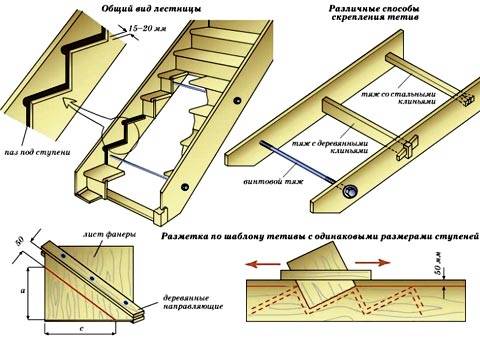 настенную тетиву крепим к стене с помощью глухарей. На второй тетиве собираем и соединяем ступени с настенной тетивой. Крепить будущие ступени можно к тетивам и с помощью вырезанных пазов.
