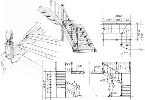 Приступая к изготовлению лестницы своими руками, лучше всё рассчитать на бумаге и нарисовать чертёж и продумать расположение лестницы в доме, чтобы не потерять плоды своих размышлений. Если в процессе подготовки к работе вы сочтёте задачу слишком сложной, чертёж пригодится для мастера, который возьмётся выполнить эту работу. Более сложные лестницы следует рисовать в общих чертах, без лишней детализации.