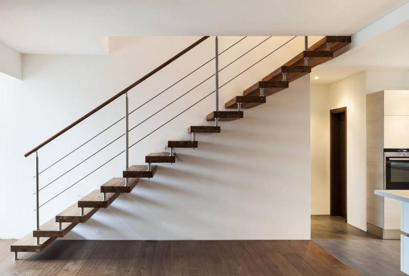 Лестницы на тетивах оснащаются боковыми балками, выполненными из металла или дерева, к которым ступени и фиксируются. Крепиться они могут к стене или специальным опорам.