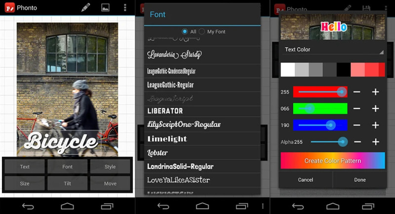 Здесь предлагается 200 шрифтов. В Phonto добавляют пользовательские шрифты, меняют цвет слов или отдельных букв одновременно. Текст вращается, меняется расстояние между буквами.