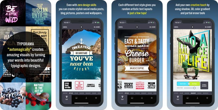 Typorama экономит массу времени, автоматически создавая сложные макеты текста с различными шрифтами и гарнитурами. Всего за несколько нажатий вы получите красивый текст на выбранном вами фоне. В Photoshop это может занять несколько часов. Вы можете экспортировать свои творения с разрешением до 2048 x 2048 пикселей. Правда, версии для Android у приложения нет.