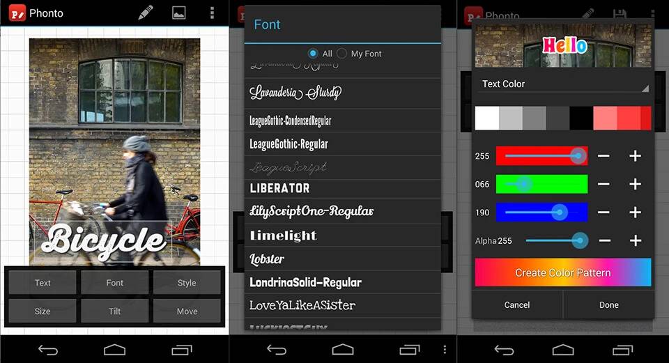 Здесь предлагается 200 шрифтов. В Phonto добавляют пользовательские шрифты, меняют цвет слов или отдельных букв одновременно. Текст вращается, меняется расстояние между буквами.
