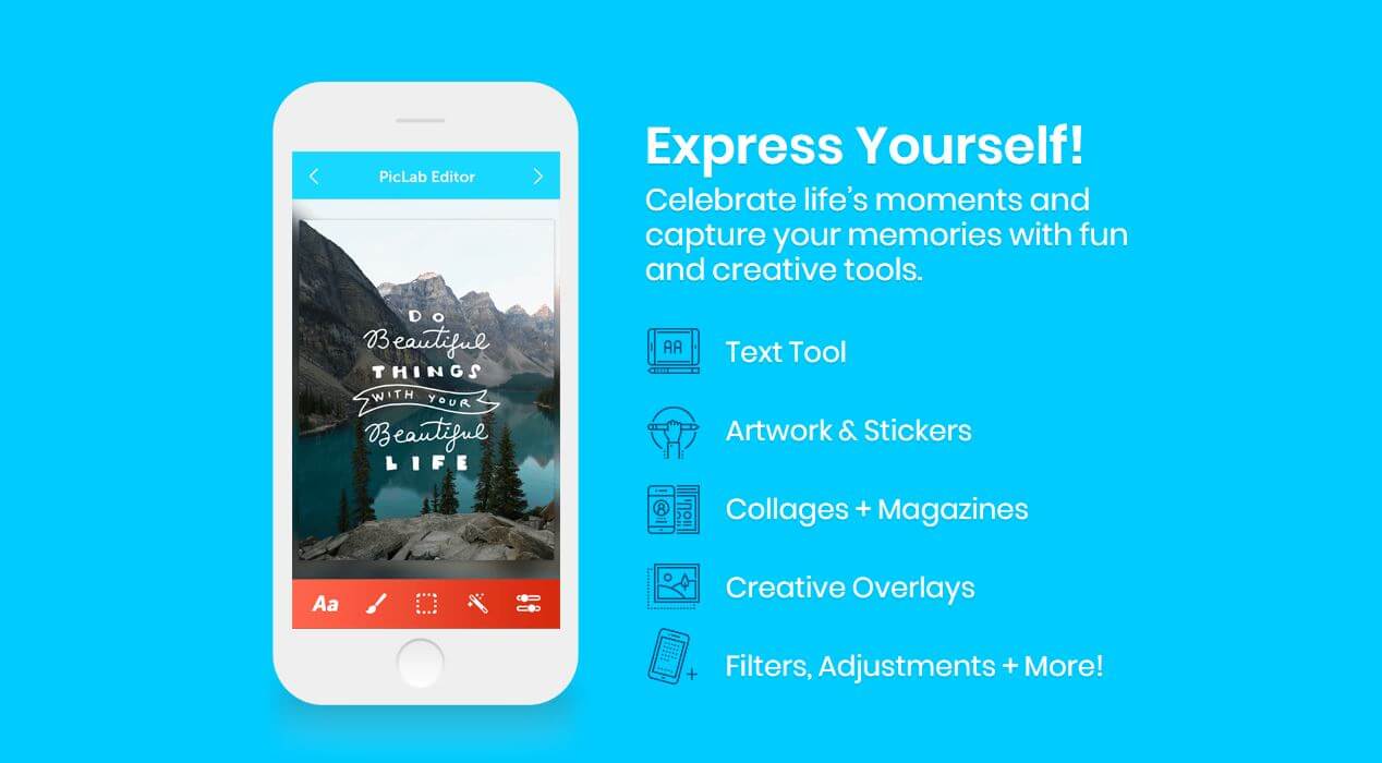 PicLab – создаёт подписи к фотографиям в инстаграм, а также делает изображения и стикеры. Много встроенных фильтров и эффектов.