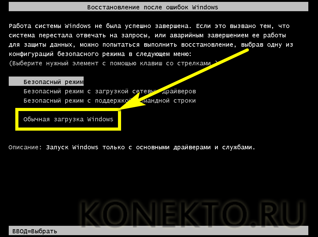 Включить компьютер или ноутбук и дождаться полной загрузки. Если по каким-либо причинам вход в систему в обычном порядке невозможен, следует попробовать «Безопасный режим», выбрав нажатием клавиши Enter соответствующий пункт на стартовом экране. Если же проблем нет, для восстановления системы достаточно будет «Обычной загрузки Windows».