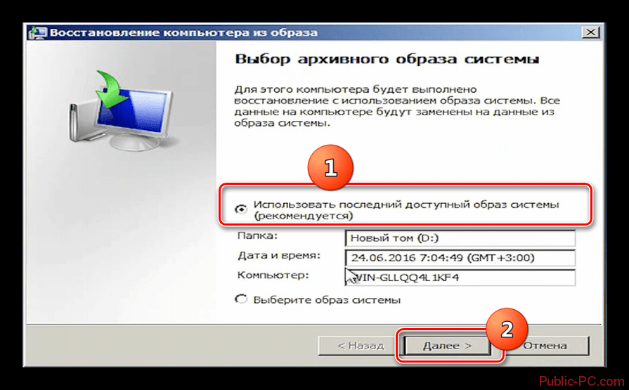 В следующей вкладке требуется выбрать образ, с которого будет восстанавливаться система. Можно указать последнюю созданную копию, нажав на соответствующую кнопку, или найти образ на ПК, кликнув «Выберите образ»