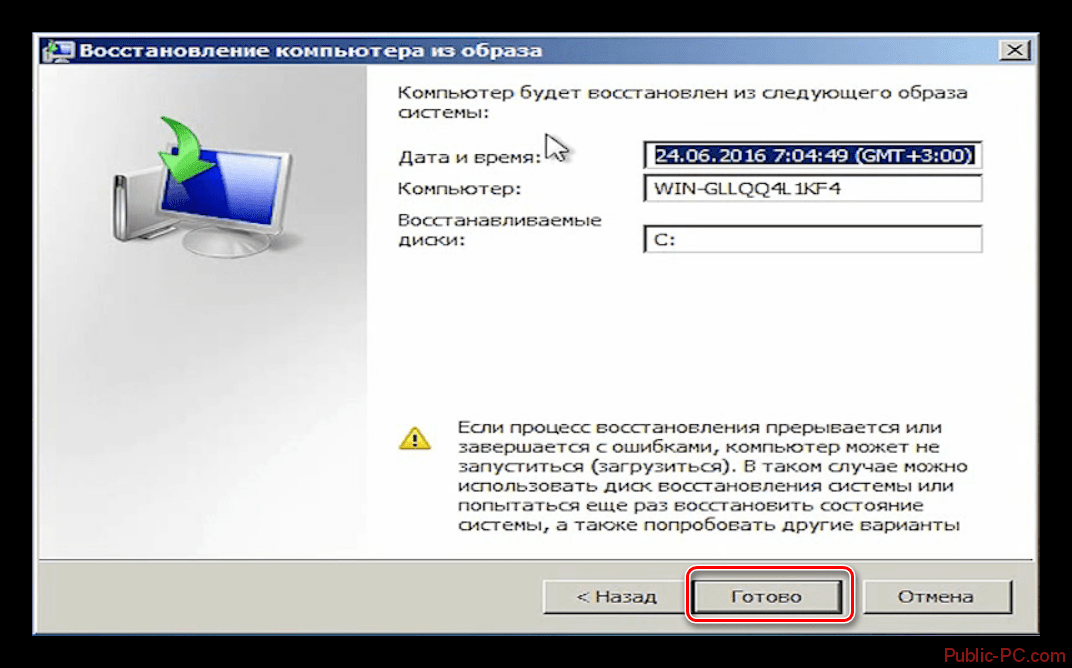 Ознакомиться с параметрами операции и щёлкнуть по кнопке «Готово». Если надобность в восстановлении отпала или необходимо выбрать другую точку, следует воспользоваться соответственно кнопками «Отмена» и «Назад».