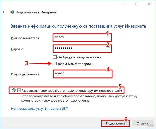 - Если вы планируете настроить автоматическое подключение PPPoE в Windows, установите галочку у строки «Запомнить пароль».