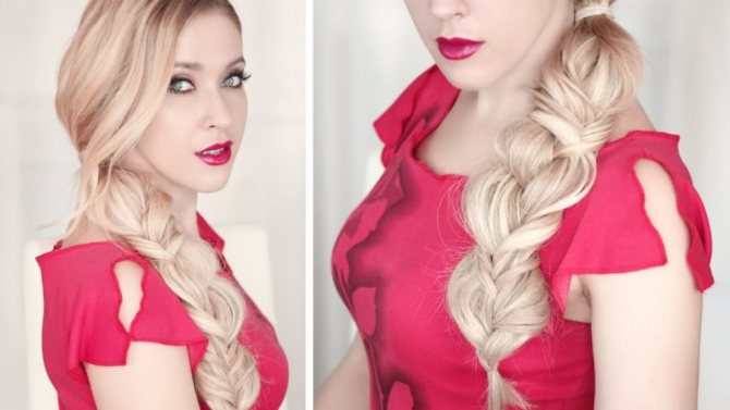 В этом случае все волосы сначала перекидываются через одно плечо. И только потом начинают не очень плотно переплетаться.
