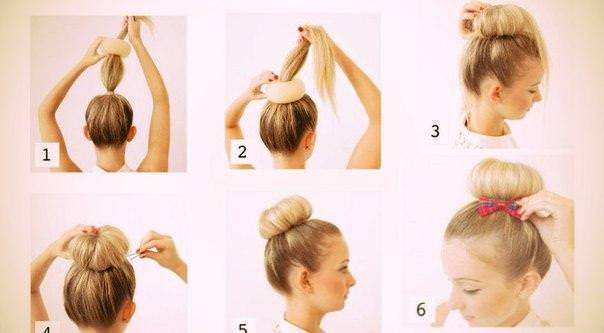 Сверху положить пончик. В связи с особенностями этой прически, бублик также рекомендуется прикреплять к основе заколками.