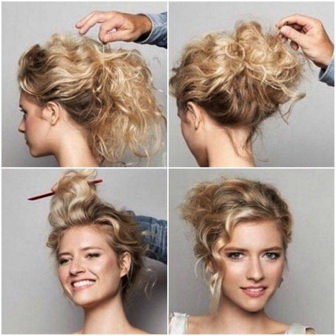 Короткие пряди по очереди накручиваем с помощью плойки, утюжка, термобигудей.Собираем завитые пряди в «хвост» и фиксируем его тонкой резинкой на затылке или на макушке (высокий «хвост» потребует дополнительной фиксации коротких волос сзади).Разделив кучеряшки на 8-9 неравномерных по толщине прядей, фиксируем каждую у основания резинки в хаотичном порядке.
