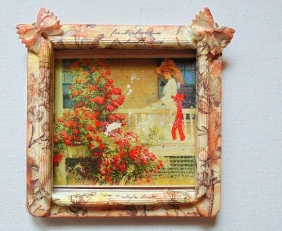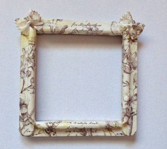 5. Вырежьте подходящие узоры с бумажной салфетки и приклейте к раме с помощью клея ПВА. Дайте клею подсохнуть. При желании тонируйте работу и сверху покройте лаком.