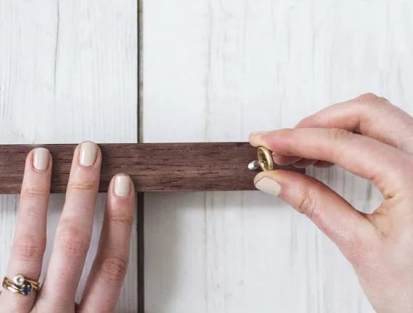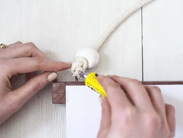 Пока плинтус сохнет, закрепите картину, фотографию или вышивку на фанере с помощью кнопок или гвоздей.
