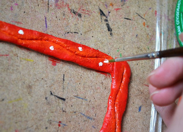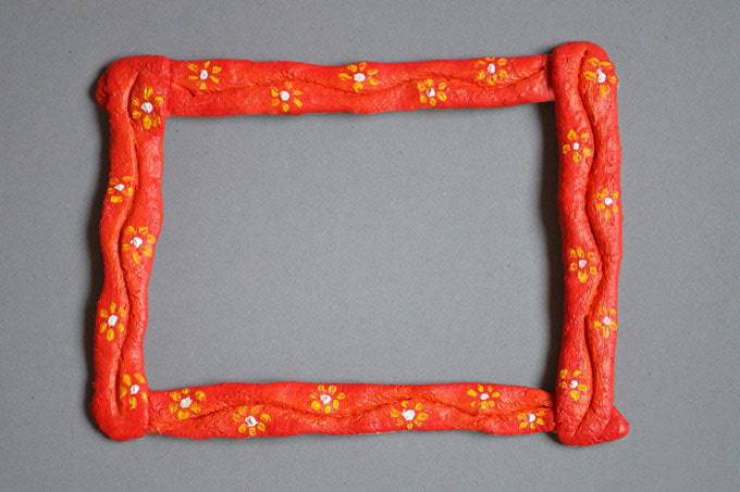 Затем окрасьте рамку из теста акриловыми красками. Периодически макая кисть в растительное масло. Следите, чтобы все места были прокрашены.
