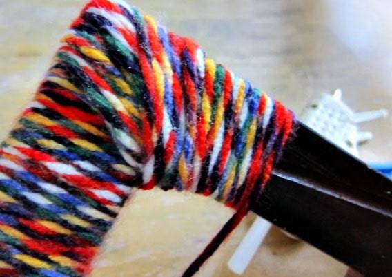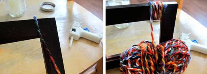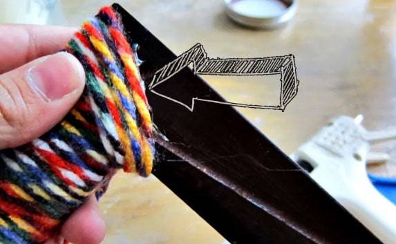 3. Когда вся рама обернута пряжей, отрежьте конц нитки и закрепите его с изнаночной стороны рамы горячим клеем.