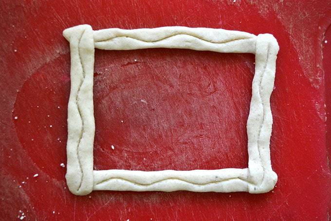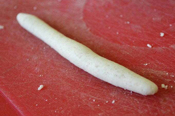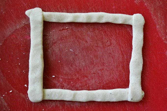 Теперь из теста надо сделать прямоугольник. Для этого катаем колбаску из теста и нарезаем его на 4 части. 2 части – длинных и 2 части – коротких.