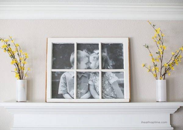Даже старая оконная рама небольшого размера, обновленная и покрытая краской, может стать отличной современной рамкой для семейных фото!