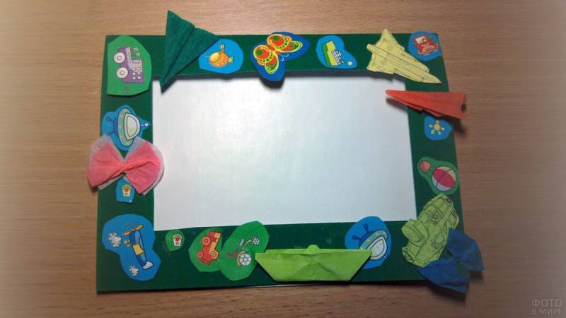 - Украсьте рамку по своему вкусу. Можно использовать бумажные звездочки, надписи «С Днём защитника Отечества» или другие элементы декора.