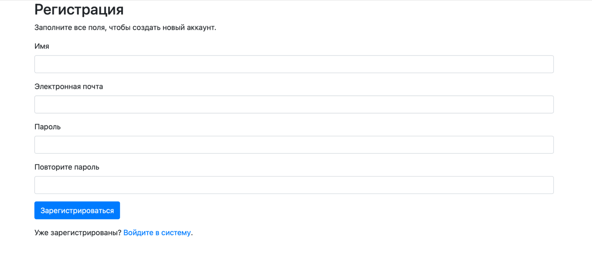 Сохраняем всё в файле register.html и открываем в браузере. Получилась простая и стильная форма регистрации: