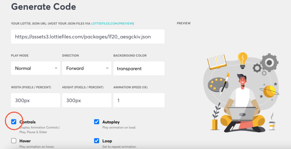 Deselect Controls so they’re not visible on the animation. Then scroll to the Generated Code section where you will find a tag holding the JavaScript that powers the animation and the tag that holds the animation.