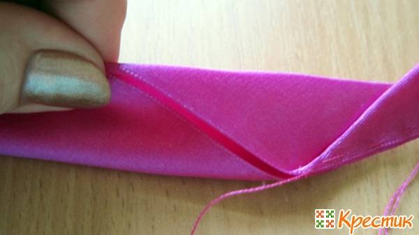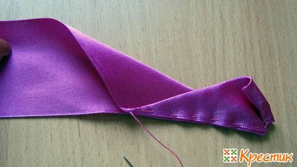 Ленту сложить вдоль пополам изнаночной стороной внутрь. Сделать наметку. Начинать под углом 45 градусов, т.е. наискосок, далее сметывать по линии кромки. Таким образом, придается пышность розе. Заканчивайте сметывать тоже под углом.