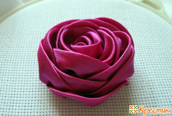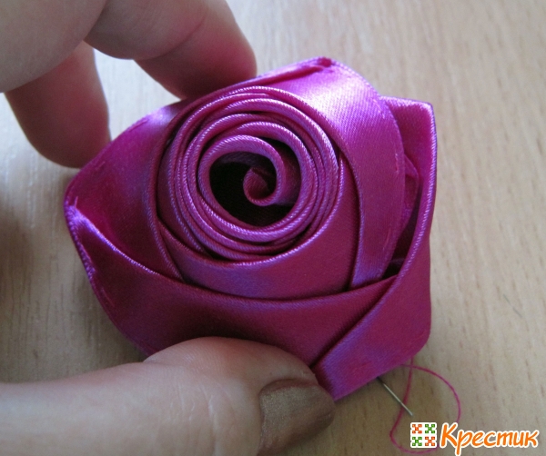 Оставив кончик ленты, равный ширине + 1,5, отрежьте. Отогните его и оберните вокруг цветка. Закрепите розу, крепко прошив иглой. Обрежьте, не задев ленту и сделанные стежки. Роза готова.