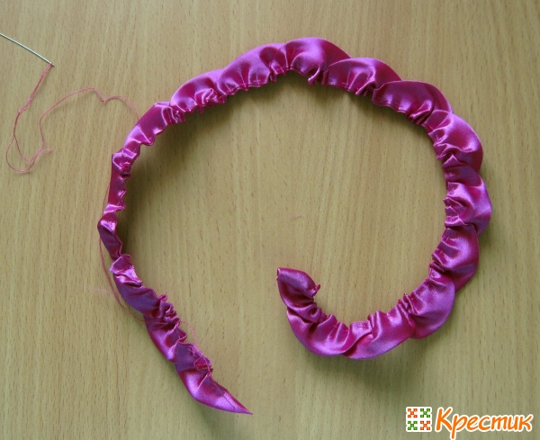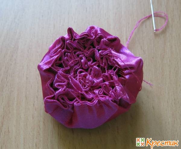 Потянув за нить, присборить ленту. Начало ленты завернуть, сформировав бутон, закрепить, прошив его.