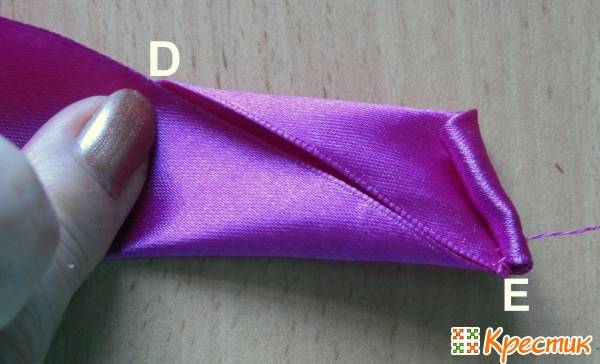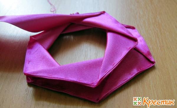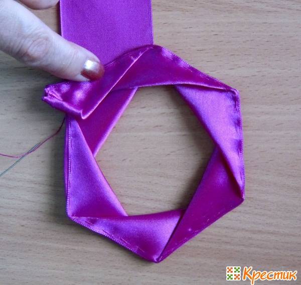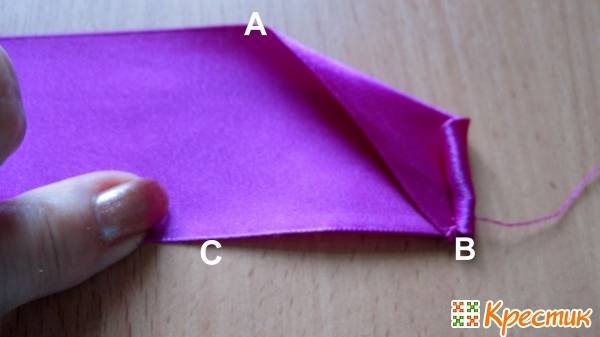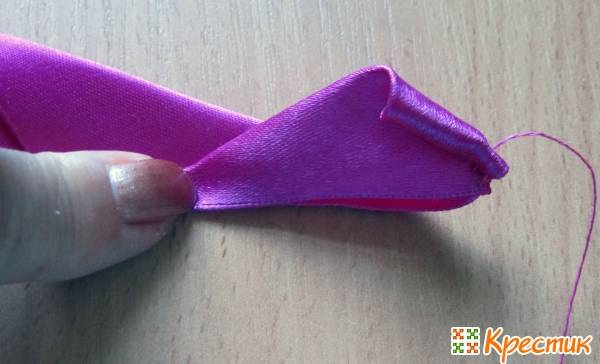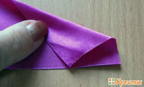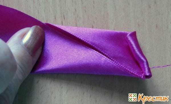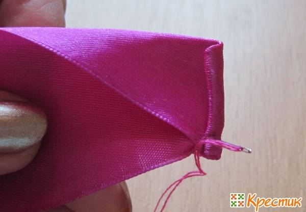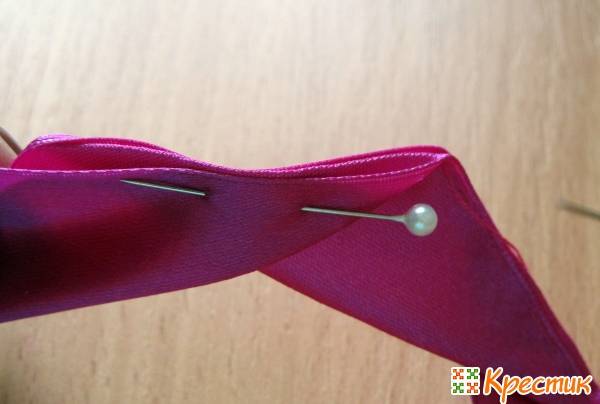 Начинаем, как обычно – сгибаем кончик ленты под прямым углом. Еще раз загибаем угол. Закрепляем булавкой. Фиксируем ниткой.