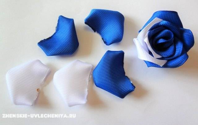 Сборку украшения канзаши начинайте с серединки розы. Для нее понадобится 12 синей и 10 отрезков белой ленты. Все одной длины – 6 см. Как сделать лепесток, рассмотрено на примере синего. Верхние края заготовки опустите вниз, образуя при этом треугольники. Спаяйте.