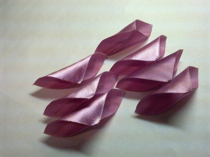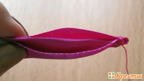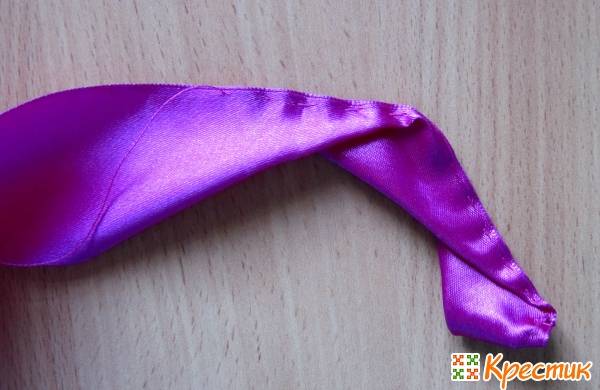 - необходима розовая лента, которую мы сворачиваем вдоль на две половины, изнаночная сторона, должна оказаться внутри;