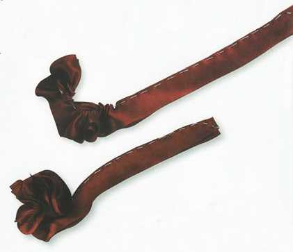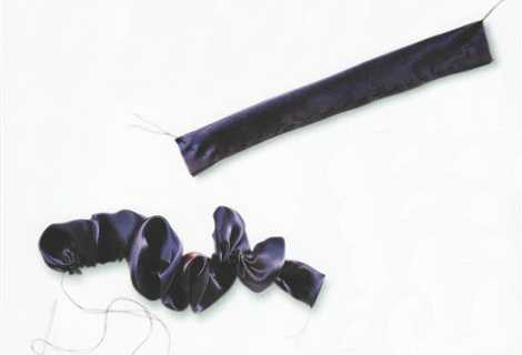 Берем второй отрезок ленты. Кончики с двух сторон сгибаем под углом 90 градусов, скалываем булавками и по длинному краю сметываем, слегка стягивая нить.