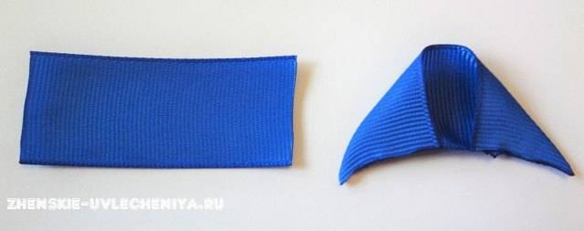 Теперь нужно сделать своими руками лепестки с бантиком. Нарежьте 16 полосок синей репсовой ленты длиной по 10 см. Одну сложите его пополам. Посередине хорошо прижмите пальцами, можно провести огнём, чтобы осталась видна линия сгиба. Отверните один край в другую сторону на 5 мм, образуя складку, хорошо прижмите. Повторите с другим концом.