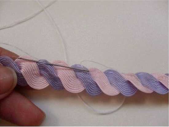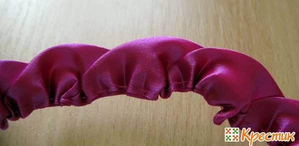 - потяните за нитку, чтобы у вас розовая лента, вышла гармошкой;