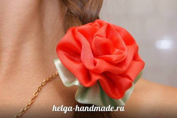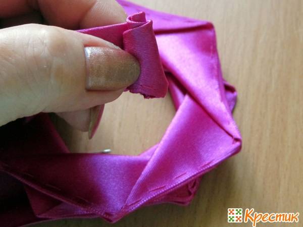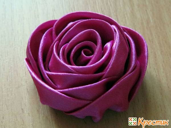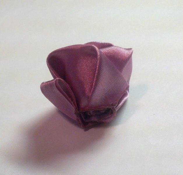 Когда роза будет готова, вывести ленту наизнанку, закрепить ее обычным способом, ленту обрезать.
