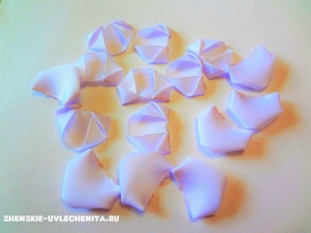 - Соберите остальные 15 лепестков из лент для розы канзаши.
