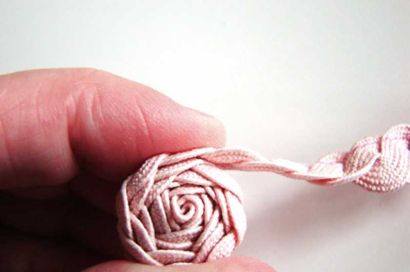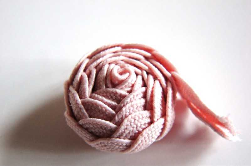 Шаг 4. Когда вы закончите, у вас должен получиться примерно вот такой бутон. Оставшийся кончик тесьмы просто подверните под цветок и зафиксируйте клеем.