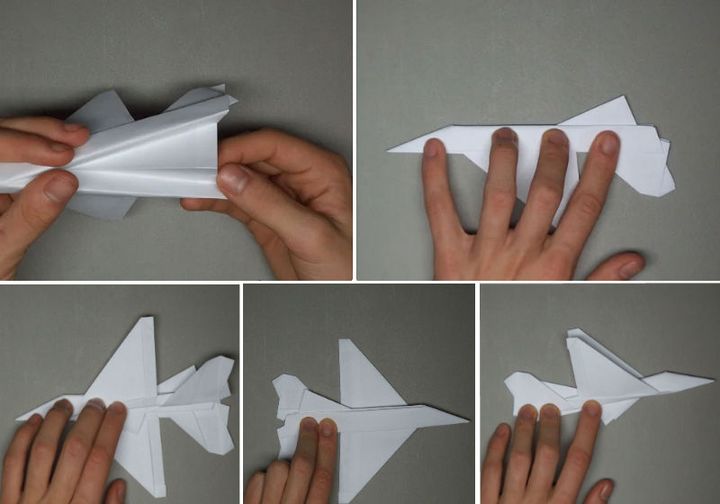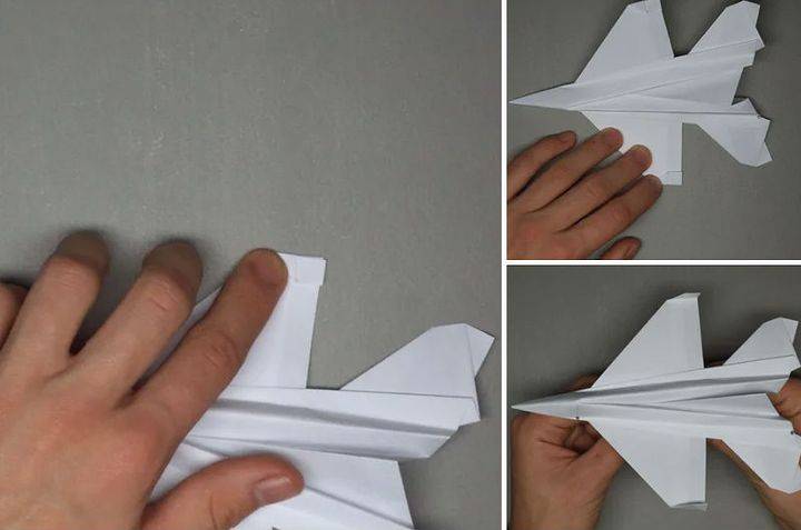 - Складываем истребитель, соединяя обе половинки. Проглаживаем места сгиба, чтобы они хорошо держали форму.